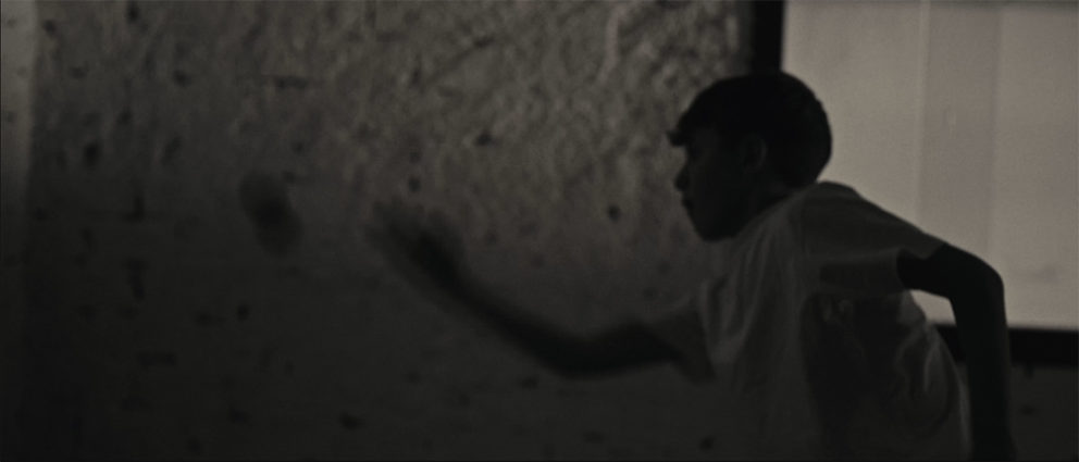 Haur bat euskal pilotan jolasten eta ondo pasatzen ari da eraikinean bihurrikeriak egiten.