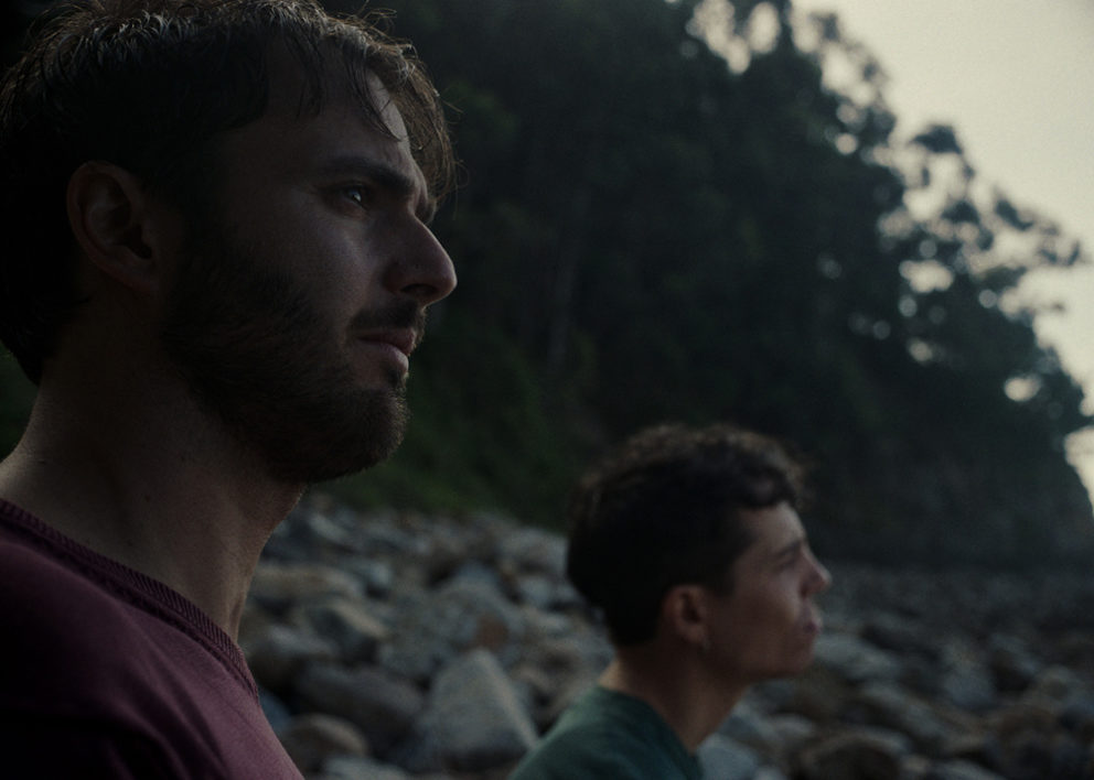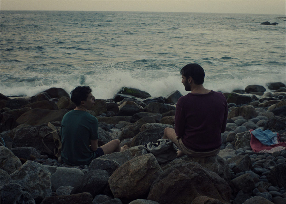 Bi lagunek bizitzari buruz hitz egiten dute itsasertzean.
