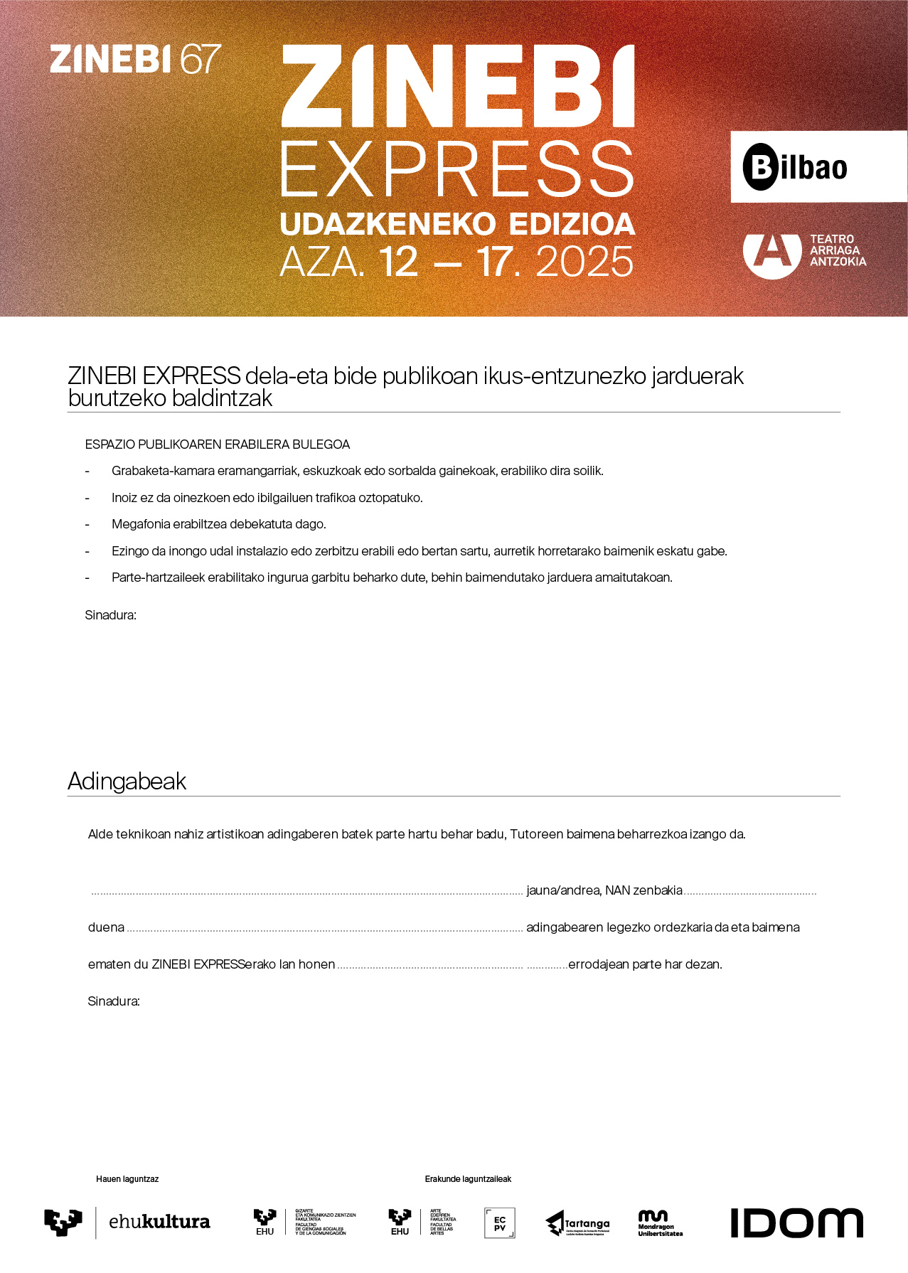 El concurso de cortometrajes ZINEBI Express celebrará su 17ª edición del 12 al 17 de noviembre de 2025. Está organizado por el Festival Internacional de Cine Documental y Cortometraje de Bilbao, ZINEBI, con la colaboración de EHUKultura y la participación de la Facultad de Bellas Artes de la UPV/EHU, la Escuela de Cine del País Vasco, el Centro Integrado de Formación Profesional de Tartanga y abierto a otras entidades y escuelas. Cuenta con el apoyo y patrocinio de IDOM.