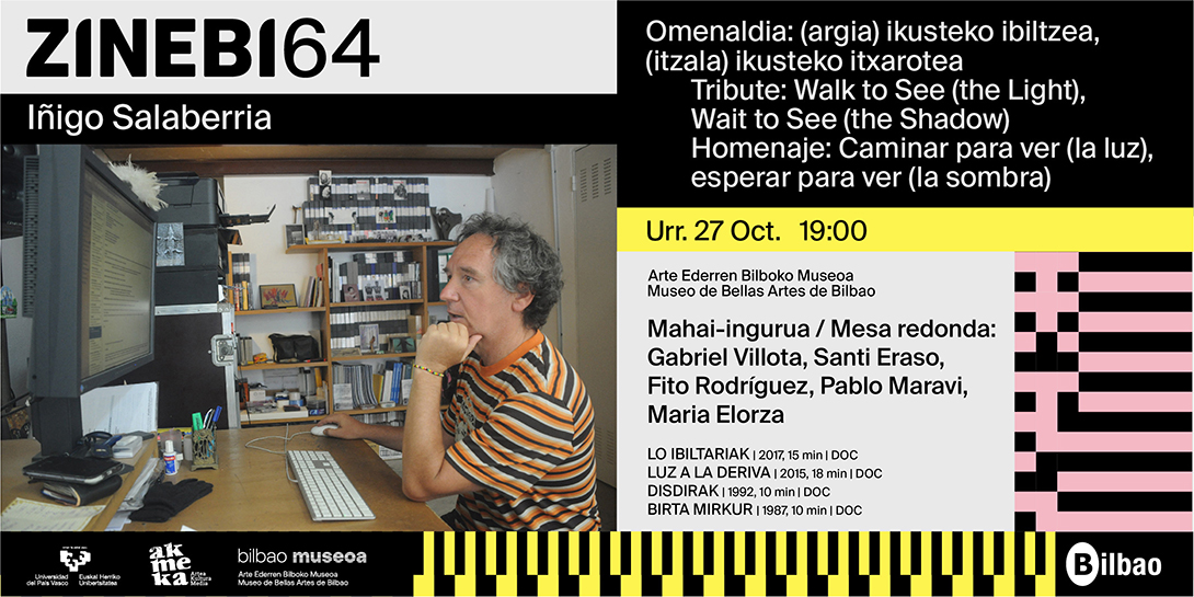 El Festival Internacional de Cine Documental y Cortometraje de Bilbao – ZINEBI, organizado por el Ayuntamiento de Bilbao, colabora en la organización del acto de homenaje a Iñigo Salaberria, galardonado en su 64.ª edición con el premio honorífico Mikeldi de Honor. La obra del videoartista y cineasta de Errenteria será la protagonista del encuentro homenaje que tendrá lugar el jueves 27, a las 19:00 horas, en el auditorio del Museo de Bellas Artes, titulado “Homenaje a Iñigo Salaberria. Caminar para ver (la luz), esperar para ver (la sombra)”, propuesto por Videoflux (Grupo de Investigación AKMEKA de la Universidad del País Vasco) y comisariado por el profesor Gabriel Villota.